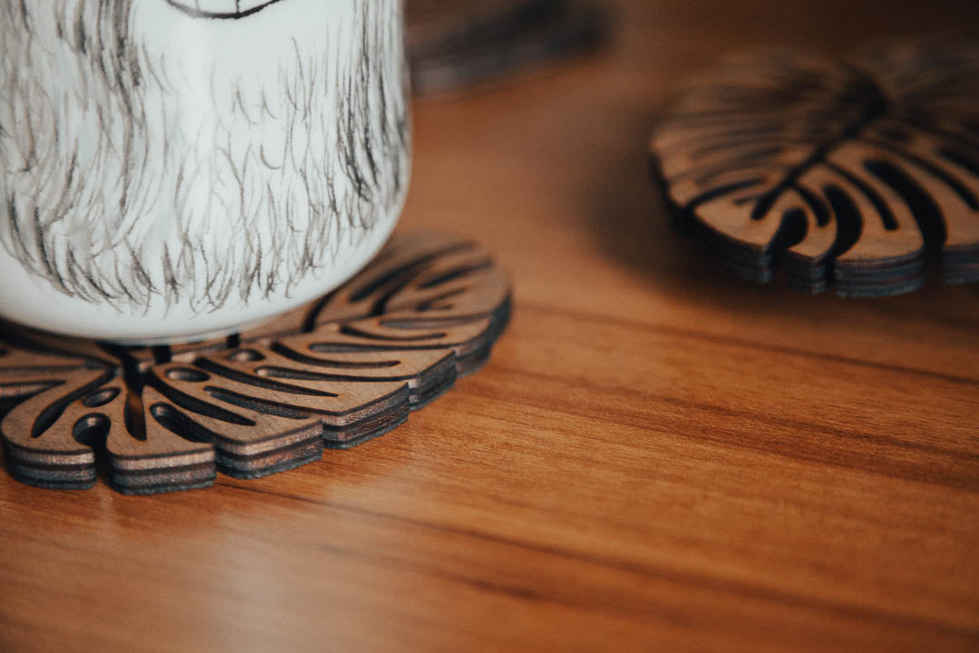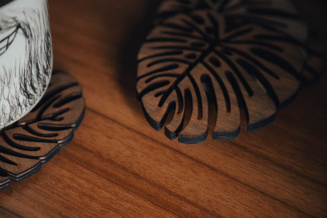Bring a touch of nature to your home with our handcrafted wooden coasters, beautifully shaped like exotic leaves.
